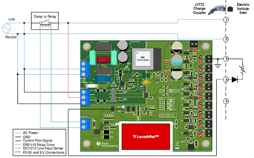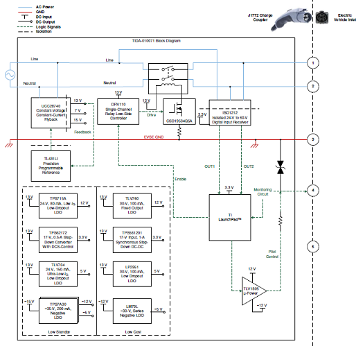 SAE J1772-compliant electric vehicle service equipment reference design for level 1 and 2 EV charger Electric vehicle service equipment (EVSE) facilitatespower delivery to electric vehicles safely from the grid.An EVSE control system consists of an auxiliary powerstage, an off-board AC/DC high power stage (only inDC charging stations), energy metering unit, AC andDC residual current detector, an isolation monitor unit,relays and contactors with drive, two-waycommunication over single wire, and service and userinterfaces. This reference design highlights an ultralowstandby isolated AC/DC auxiliary power stagefollowed by converters and linear regulators, acomparator-based control pilot interface to meet theSAE J1772 standard, an efficient relay and contactordrive, and isolated line voltage sensing across therelay and contactor.